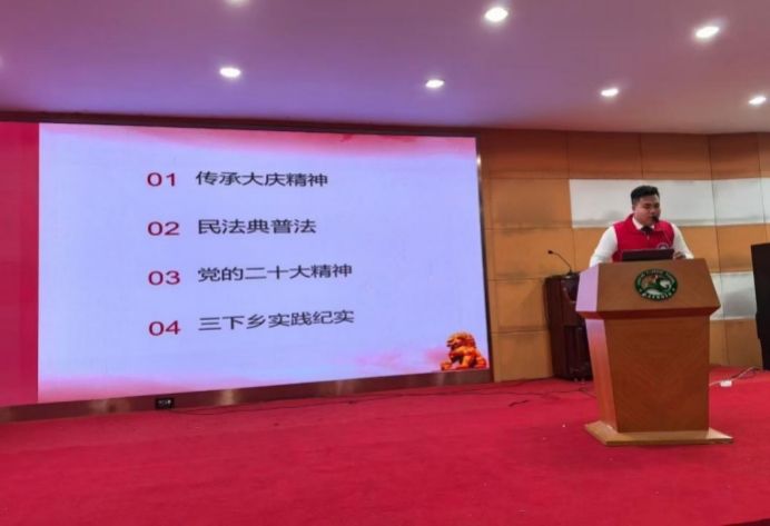 随后,王宇航代表志愿服务团队从传承大庆精神、民法典普法、党的二十大精神以及“三下乡”实践纪实四个方面展开宣讲。
