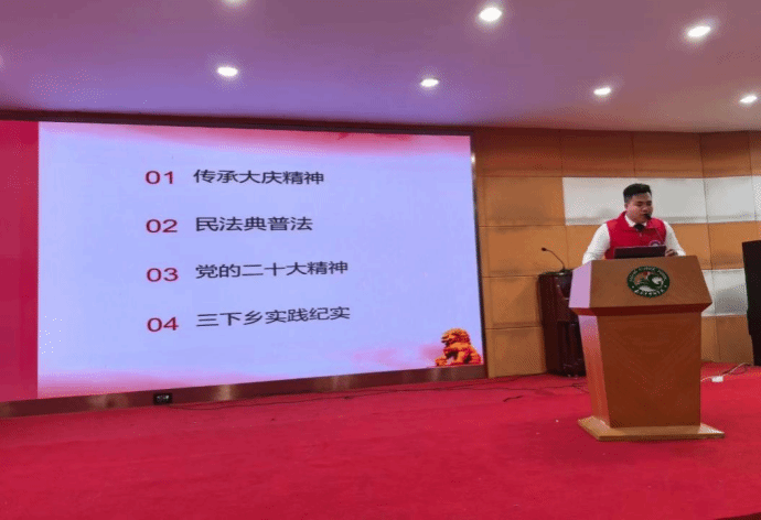随后,王宇航代表志愿服务团队从传承大庆精神、民法典普法、党的二十大精神以及“三下乡”实践纪实四个方面展开宣讲。