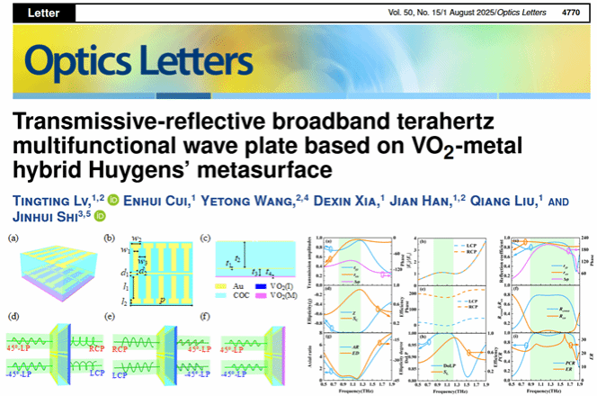 近日,我院2024级光电信息工程专业硕士研究生崔恩晖在吕婷婷老师的指导下发表研究成果“Transmissive-reflective broadband terahertz multifunction waveplate based on VO2-metal hybrid Huygens’ metasurface”,刊载于中科院二区TOP期刊《Optics Letters》(IF=3.3)。