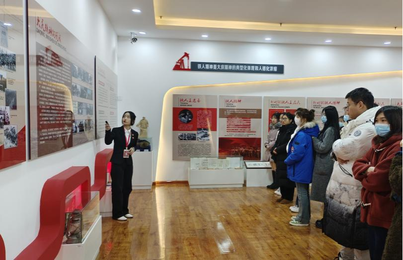 随后,同学们有序进入大庆精神育人展馆,展馆以红色为主调,讲解员讲述了大庆石油会战历史、大庆精神的形成及内涵、新时期的铁人精神和大庆精神等。在这片土地上,因为有王进喜及石油工人们的无畏精神、为石油事业奉献终身的精神才孕育出了大庆精神。