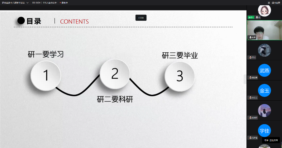 在此次论坛上,蒋宇从研一、研二和研三三个阶段的目标出发,为大家进行了经验分享。强调在研一时要抓好专业方向的理论基础、提高英语水平、积极参加比赛,在研二阶段要多听讲座、多看文献、撰写并发表小论文,研三要完成大论文、做好毕业论文的相关工作并考虑未来的发展,是要读博、考公还是工作。