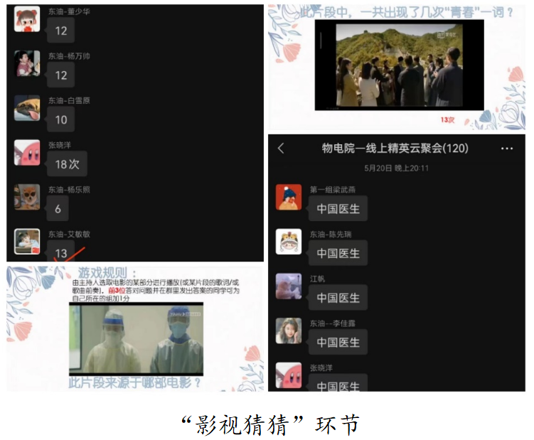分享环节后,开始以“头脑风暴”的展开方式进行游戏环节。游戏过程中,同学们踊跃抢答,畅所欲言,通过活跃思维和智力的数字签到、猜猜歌曲、影视猜猜的游戏环节,充分调动了同学们的活动积极性,也活跃了现场气氛。